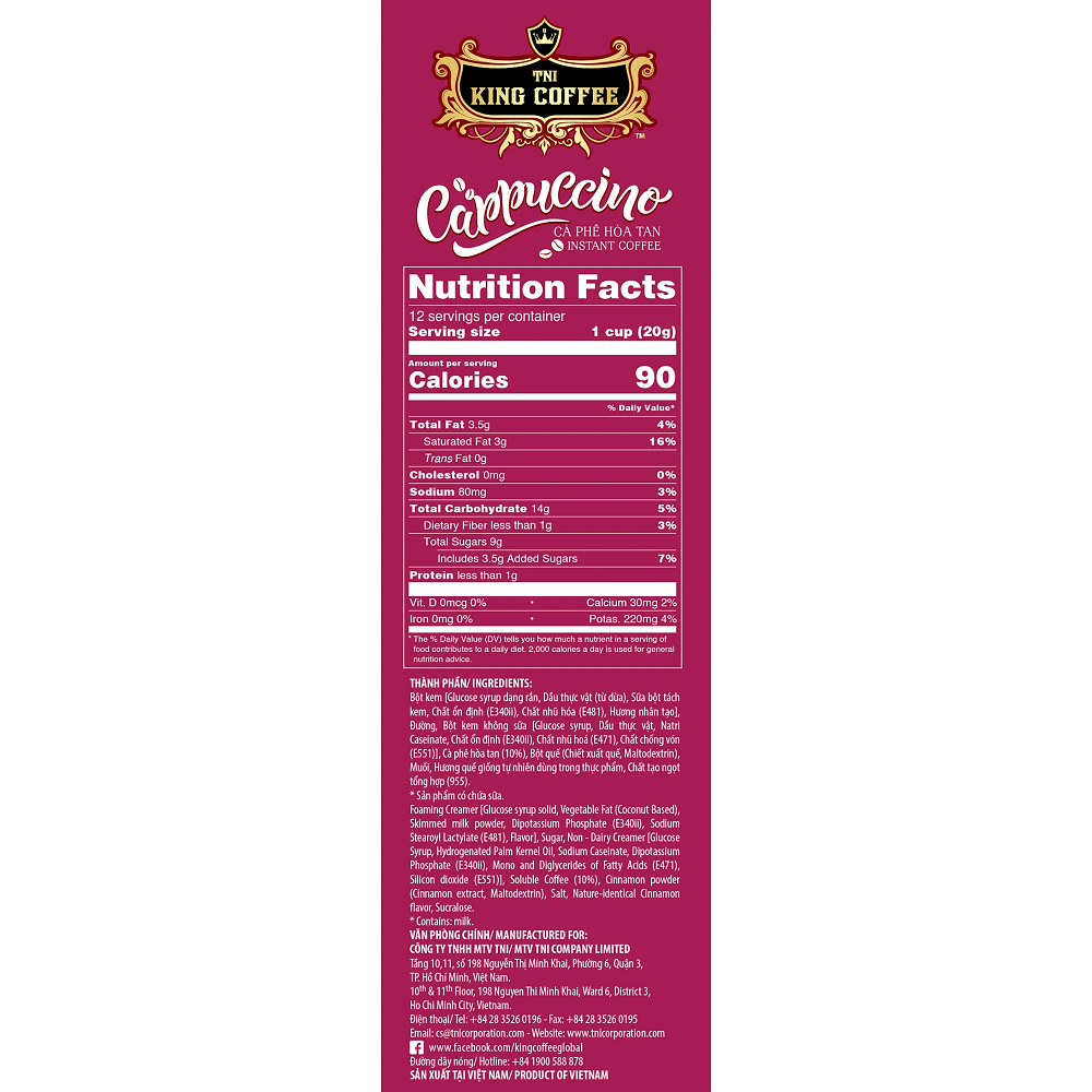 کاپوچینو دارچین کینگ کافی یک نوشیدنی فوری خوشطعم و معطر است که با ترکیبی متعادل از قهوه، شیر خشک و عطر دارچین آماده میشود. هر ساشه ۲۰ گرمی به راحتی در آب داغ حل میشود و یک فنجان نوشیدنی خامهای و خوشعطر دارچینی آماده میکند.